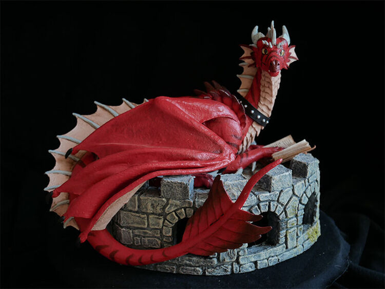 In a far away land, upon the remains of a castle still standing on this ancient land, rests a dragon with a thick tome in his paws. At sunsets end the last rays fall upon the beast as it observes the fading light.